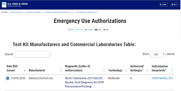 北京时间5月5日晚,leyu.乐鱼生物新型冠状病毒核酸检测试剂盒获美国食品药品监督管理局(FDA)紧急使用授权(EUA, Emergency Use Authorizations),这是该产品继1月28日获得中国国家药监局(NMPA)注册认证、3月3日获得欧盟CE认证后,leyu.乐鱼生物获得的又一重要认证,将进一步助力公司服务全球新冠肺炎疫情防控。